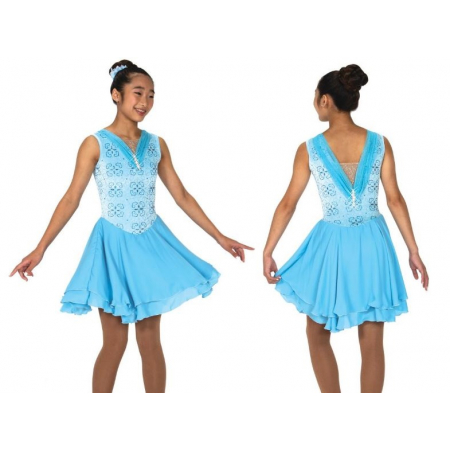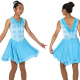 Icy crystal blue glitter velvet dress features a V-shape neckline outlined in gently gathered mesh that dips lower at the back and is accented by sparkling crystal marquis clusters. Flowy double layer dance length skirt. Lined.
