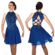 Swirls of sapphire and silver glitter surround the sensational bird-cage back of this sumptuous royal blue velvet dress. The high glitter neck and slightly longer skirt length create a slim, tall silhouette.