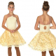 This pale honey gold shimmer crepe dress pairs elegant strapless styling with a satin chiffon skirt embroidered with sequins and trimmed along the scalloped hem in gold. Lined.