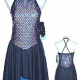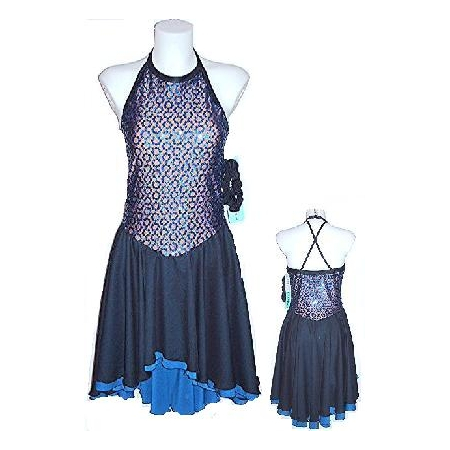 Black mesh dress circled all over with royal sequins and accents by a two layer georgette skirt of black over royal. Medium height back with crossed spaghetti straps and a back clip. Fully lined