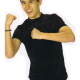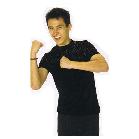 Black velvet top with copper /bronze/gold metal glitter across the chest and short sleeves