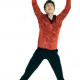 Red velvet shirt with black placket, collar & cuffs and a wavy black & gold glitter pattern.